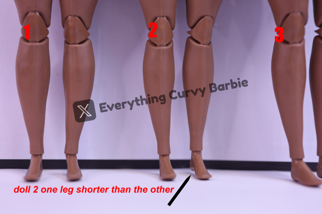 • Doll 2 has one leg clearly shorter than the other (see the close-up comparison).