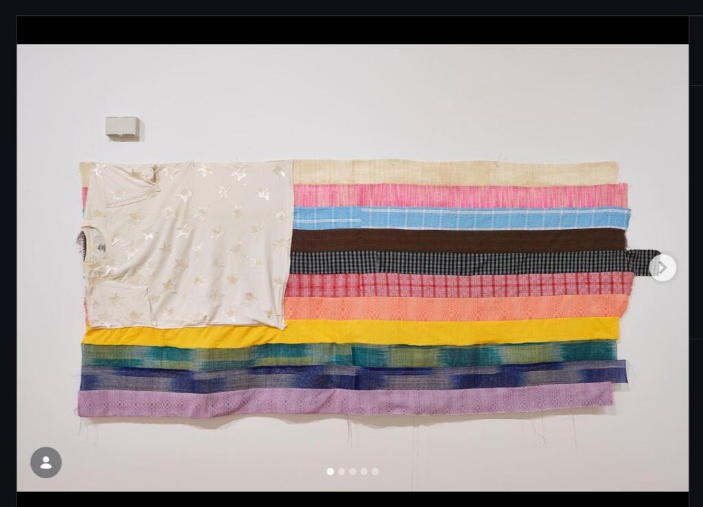 One of his personal artworks, titled “U.S.ako”, reinterprets the American flag by replacing its traditional red and white stripes with the colors of the Pride flag, combined with Filipino textile elements.